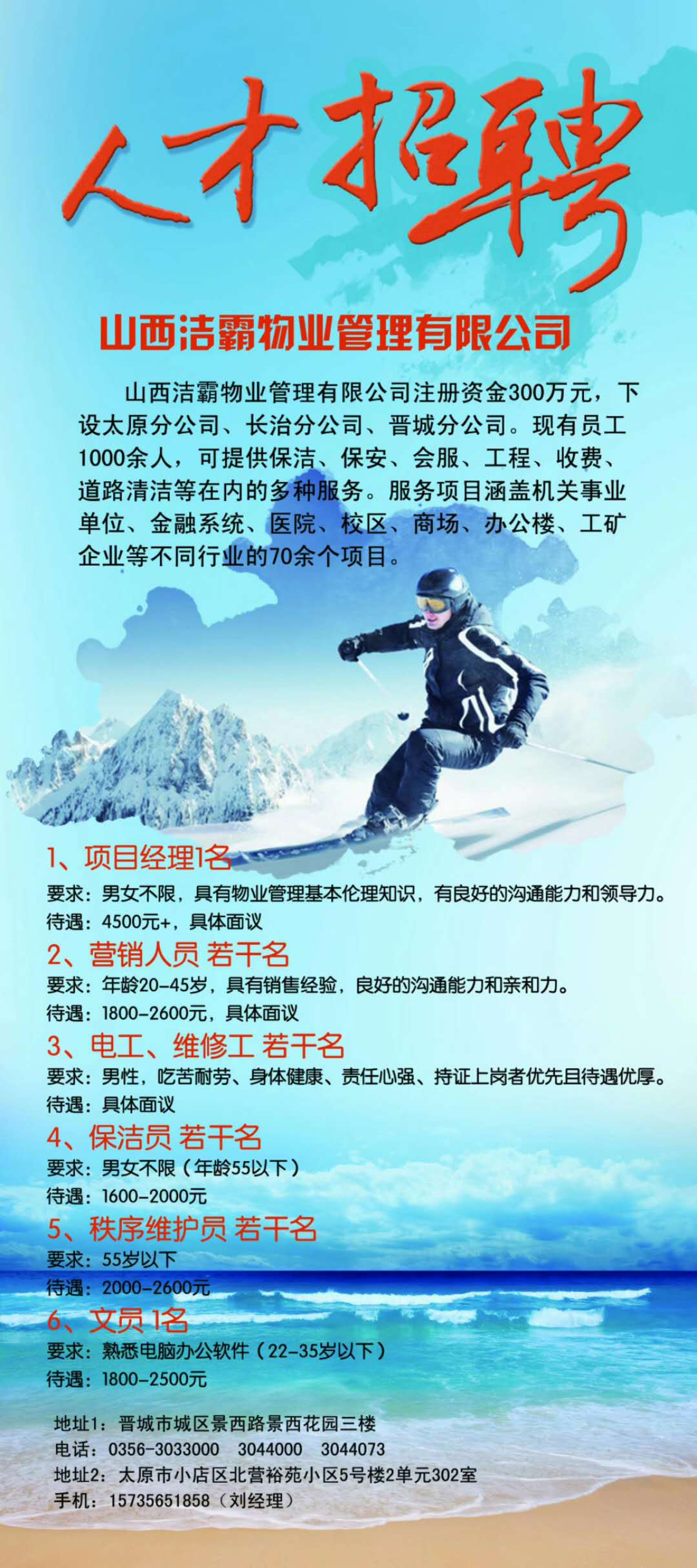 潔霸公司太原分公司現(xiàn)在正是招賢納才時候,希望各位有理想、有抱負(fù)的年輕人可以加入我們,共同為潔霸公司更加美好的明天而努力!