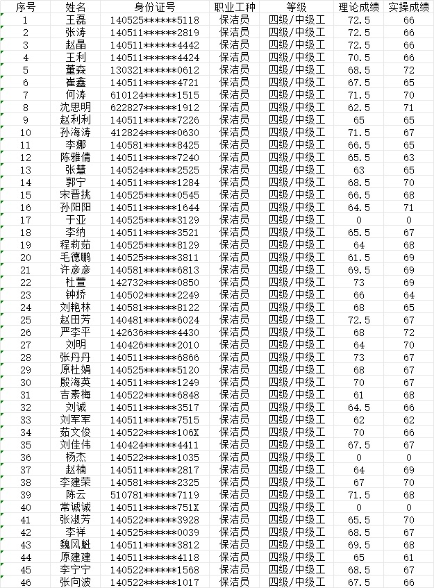 晉城市潔霸清潔服務股份有限公司職業(yè)技能等級認定中心現(xiàn)將2024年1月21日認定人員成績公示如下: