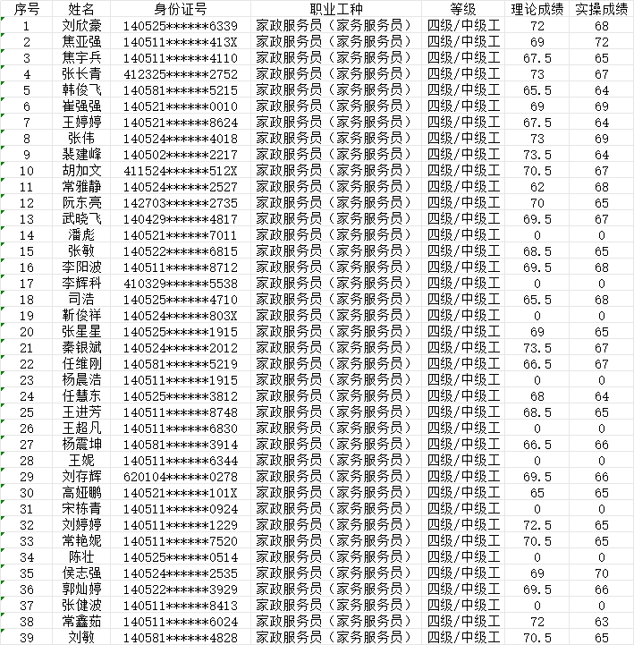 晉城市潔霸清潔服務(wù)股份有限公司職業(yè)技能等級(jí)認(rèn)定中心現(xiàn)將2024年1月28日認(rèn)定人員成績(jī)公示如下: