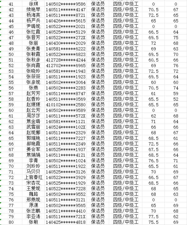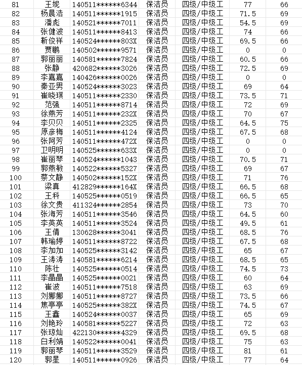晉城市潔霸清潔服務(wù)股份有限公司職業(yè)技能等級認(rèn)定中心2024年2月4日第10批保潔員中級認(rèn)定人員成績公示