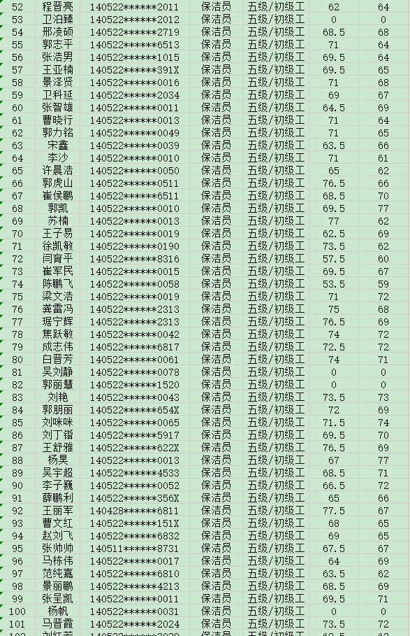 晉城市潔霸清潔服務(wù)股份有限公司職業(yè)技能等級認(rèn)定中心2024年8月17日第29批保潔員初級認(rèn)定人員成績公示