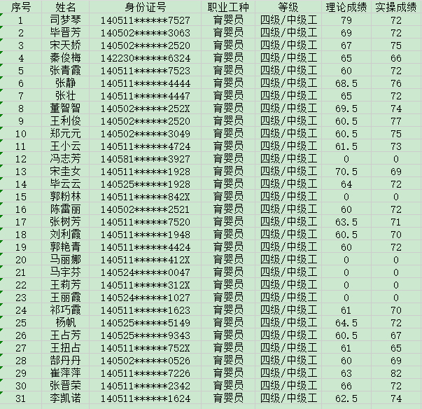 晉城市潔霸清潔服務(wù)股份有限公司職業(yè)技能等級(jí)認(rèn)定中心2024年9月27日第10批育嬰員中級(jí)認(rèn)定人員成績(jī)公示